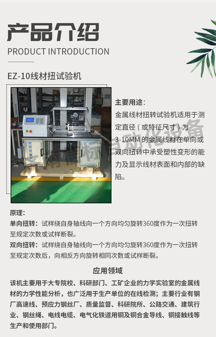 金屬線材扭轉(zhuǎn)試驗(yàn)機(jī)適用于測(cè)定直徑(或特征尺寸)為3-10mm 的金屬線材在單向或雙向扭轉(zhuǎn)中承受塑性變形的能力及顯示線材表面和內(nèi)部的缺陷。 二、原理: 單向扭轉(zhuǎn):試樣繞自身軸線向一個(gè)方向均勻旋轉(zhuǎn)360度作為一次扭轉(zhuǎn)至規(guī)定次數(shù)或試樣斷裂。 雙向扭轉(zhuǎn):試樣繞自身軸線向一個(gè)方向均勻旋轉(zhuǎn)360度作為一次扭轉(zhuǎn)至規(guī)定次數(shù)后,向相反方向旋轉(zhuǎn)相同次數(shù)或試樣斷裂。 金屬線材扭轉(zhuǎn)試驗(yàn)機(jī)適用標(biāo)準(zhǔn): 金屬線材扭轉(zhuǎn)試驗(yàn)機(jī)適用于中華人民共和國(guó)標(biāo)準(zhǔn)GB/T 239.1-2012《金屬材料 線材 第一部分 單向扭轉(zhuǎn)試驗(yàn)方法》、GB/T 239.2-2012《金屬材料 線材 第二部分 雙向扭轉(zhuǎn)試驗(yàn)方法》,也適用于國(guó)際標(biāo)準(zhǔn)ISO 7800:2003《金屬線材單向扭轉(zhuǎn)試驗(yàn)方法》和ISO 9649:1990《金屬線材雙向扭轉(zhuǎn)試驗(yàn)方法》。 金屬線材扭轉(zhuǎn)試驗(yàn)機(jī)應(yīng)用領(lǐng)域: 該機(jī)主要用于大專院校、科研部門、工礦企業(yè)的力學(xué)實(shí)驗(yàn)室的金屬線材的力學(xué)性能分析,也廣泛用于生產(chǎn)單位的在線檢測(cè);主要行業(yè)有鋼廠高速線、預(yù)應(yīng)力鋼絲廠、質(zhì)量監(jiān)督、科研院所、公路交通、建筑行業(yè)、鋼絲繩、電線電纜、電氣化鐵道用銅及銅合金導(dǎo)線、銅接觸線等生產(chǎn)和使用部門。更多金屬線材扭轉(zhuǎn)試驗(yàn)機(jī)資料請(qǐng)聯(lián)系我們濟(jì)南信標(biāo)自動(dòng)化設(shè)備有限公司。專業(yè)生產(chǎn)液壓萬能試驗(yàn)機(jī),疲勞試驗(yàn)機(jī),扭轉(zhuǎn)試驗(yàn)機(jī),高溫蠕變?cè)囼?yàn)機(jī),彈簧試驗(yàn)機(jī),彎曲試驗(yàn)機(jī),沖擊試驗(yàn)機(jī),彎曲強(qiáng)度試驗(yàn)機(jī),抗拉強(qiáng)度試驗(yàn)機(jī)等。