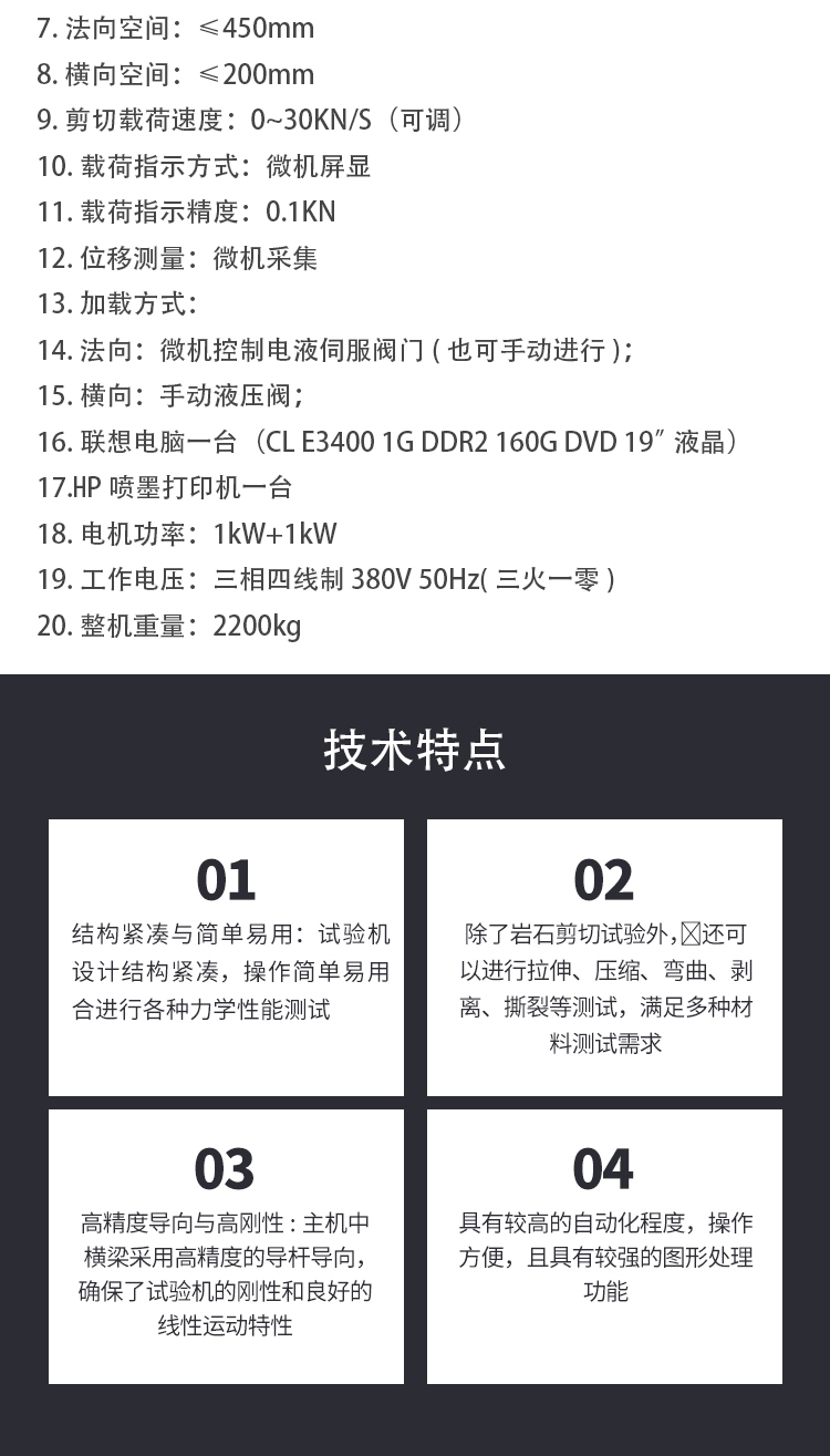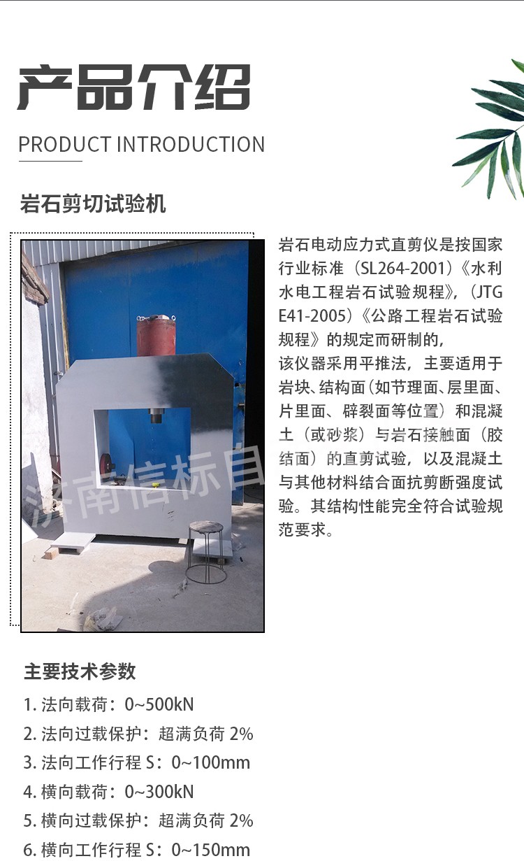 主要技術(shù)參數(shù): ?法向載荷:0~500kN ?法向過(guò)載保護(hù):超滿負(fù)荷2% ?法向工作行程S:0~100mm ?橫向載荷:0~300kN ?橫向過(guò)載保護(hù):超滿負(fù)荷2% ?橫向工作行程S:0~150mm ?法向空間 : ≤450mm ?橫向空間 : ≤200mm ?剪切載荷速度:0~30KN/S(可調(diào)) ?載荷指示方式:微機(jī)屏顯 ?載荷指示精度:0.1KN ?位移測(cè)量:微機(jī)采集 ?加載方式: ?法向:微機(jī)控制電液伺服閥門(也可手動(dòng)進(jìn)行); ?橫向:手動(dòng)液壓閥; ?聯(lián)想電腦一臺(tái)(CL E3400 1G DDR2 160G DVD 19”液晶) ?HP噴墨打印機(jī)一臺(tái) ?電機(jī)功率:1kW+1kW ?工作電壓:三相四線制 380V 50Hz(三火一零) ?整機(jī)重量:2200kg ?外形尺寸:1500×900×1735mm Equipment working conditions設(shè)備工作條件: 1.Power supply(電源):Three phase and Four wire(三相四線制); three live wire, one zero line(三火線一零線) 2.Wiring definition(接線定義):Brown - live wire, Yellow - live wire, Blue - live wire,Black – zero line 棕-火線,黃-火線,藍(lán)-火線,黑-零線; 3.Main motor power(主機(jī)功率):2.2kW(千瓦) Total; 4.Max . Normal load (最大法向力):500kN(千牛); 5.Max. Lateral load(最大橫向/剪切力):300kN(千牛); 6.hydraulic oil(液壓油):46# Hydraulic Oil@cold area or season; 68# Hydraulic Oil@hot area or season; 46#抗磨液壓油@寒冷地區(qū)或季節(jié);68#抗磨液壓油@炎熱地區(qū)或季節(jié); oil bearing(耗油量):40L(公升); 7.Weight of machine(主機(jī)重量):about 2000kg;約2噸; 8.在無(wú)震動(dòng)環(huán)境中。 9.電源電壓波動(dòng)范圍小于額定電壓的±10%。 10.地基應(yīng)平整、牢固。 試機(jī): 1.加油:油液采用46#號(hào)抗磨液壓油,加油孔在儀器左后方,將左后方蓋板打開(kāi),將油箱上方加油口保護(hù)罩打開(kāi),加油即可,油量在40L左右。 2.接電:請(qǐng)牢固連接三相電源,不可缺相。