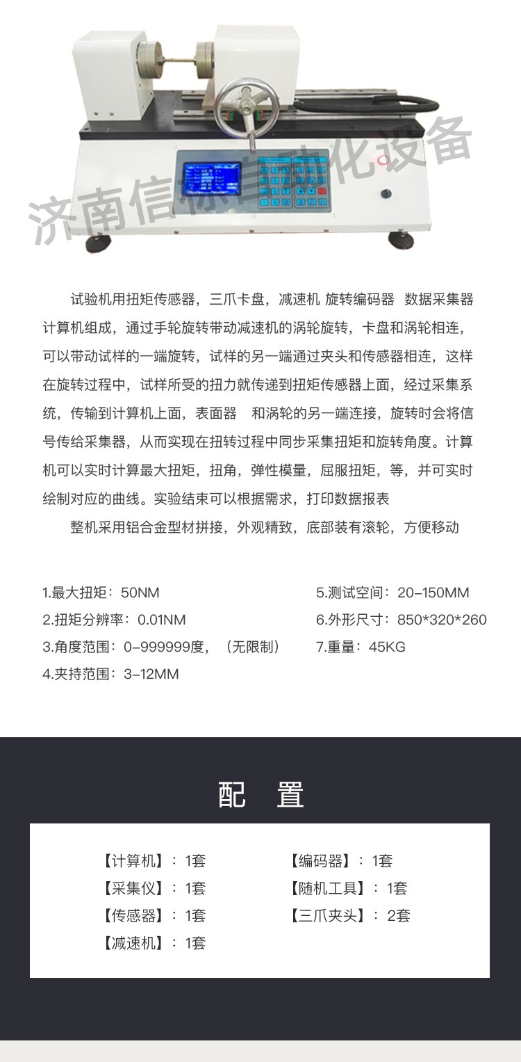 一、介紹 試驗(yàn)機(jī)用扭矩傳感器,三爪卡盤,減速機(jī) 旋轉(zhuǎn)編碼器 數(shù)據(jù)采集器 計(jì)算機(jī)組成,通過手輪旋轉(zhuǎn)帶動減速機(jī)的渦輪旋轉(zhuǎn),卡盤和渦輪相連,可以帶動試樣的一端旋轉(zhuǎn),試樣的另一端通過夾頭和傳感器相連,這樣在旋轉(zhuǎn)過程中,試樣所受的扭力就傳遞到扭矩傳感器上面,經(jīng)過采集系統(tǒng),傳輸?shù)接?jì)算機(jī)上面,表面器 和渦輪的另一端連接,旋轉(zhuǎn)時(shí)會將信號傳給采集器,從而實(shí)現(xiàn)在扭轉(zhuǎn)過程中同步采集扭矩和旋轉(zhuǎn)角度。計(jì)算機(jī)可以實(shí)時(shí)計(jì)算最大扭矩,扭角,彈性模量,屈服扭矩等,并可實(shí)時(shí)繪制對應(yīng)的曲線。實(shí)驗(yàn)結(jié)束可以根據(jù)需求,打印數(shù)據(jù)報(bào)表,整機(jī)采用鋁合金型材拼接,外觀精致,底部裝有滾輪,方便移動。試驗(yàn)機(jī)用扭矩傳感器,三爪卡盤,減速機(jī) 旋轉(zhuǎn)編碼器 數(shù)據(jù)采集器 計(jì)算機(jī)組成,通過手輪旋轉(zhuǎn)帶動減速機(jī)的渦輪旋轉(zhuǎn),卡盤和渦輪相連,可以帶動試樣的一端旋轉(zhuǎn),試樣的另一端通過夾頭和傳感器相連,這樣在旋轉(zhuǎn)過程中,試樣所受的扭力就傳遞到扭矩傳感器上面,經(jīng)過采集系統(tǒng)。 二、基本參數(shù) 1.最大扭矩:50NM 2.扭矩分辨率:0.01NM 3.角度范圍:0-999999度,(無限制) 4.夾持范圍:3-12mm 5.測試空間:20-150mm 6.外形尺寸:850*320*260 7.重量:45kg 三配置: 1.計(jì)算機(jī):1套 2.采集儀:1套 3.傳感器:1套 4.減速機(jī):1套 5.編碼器:1套 6.隨機(jī)工具:1套 7.三爪夾頭:2套