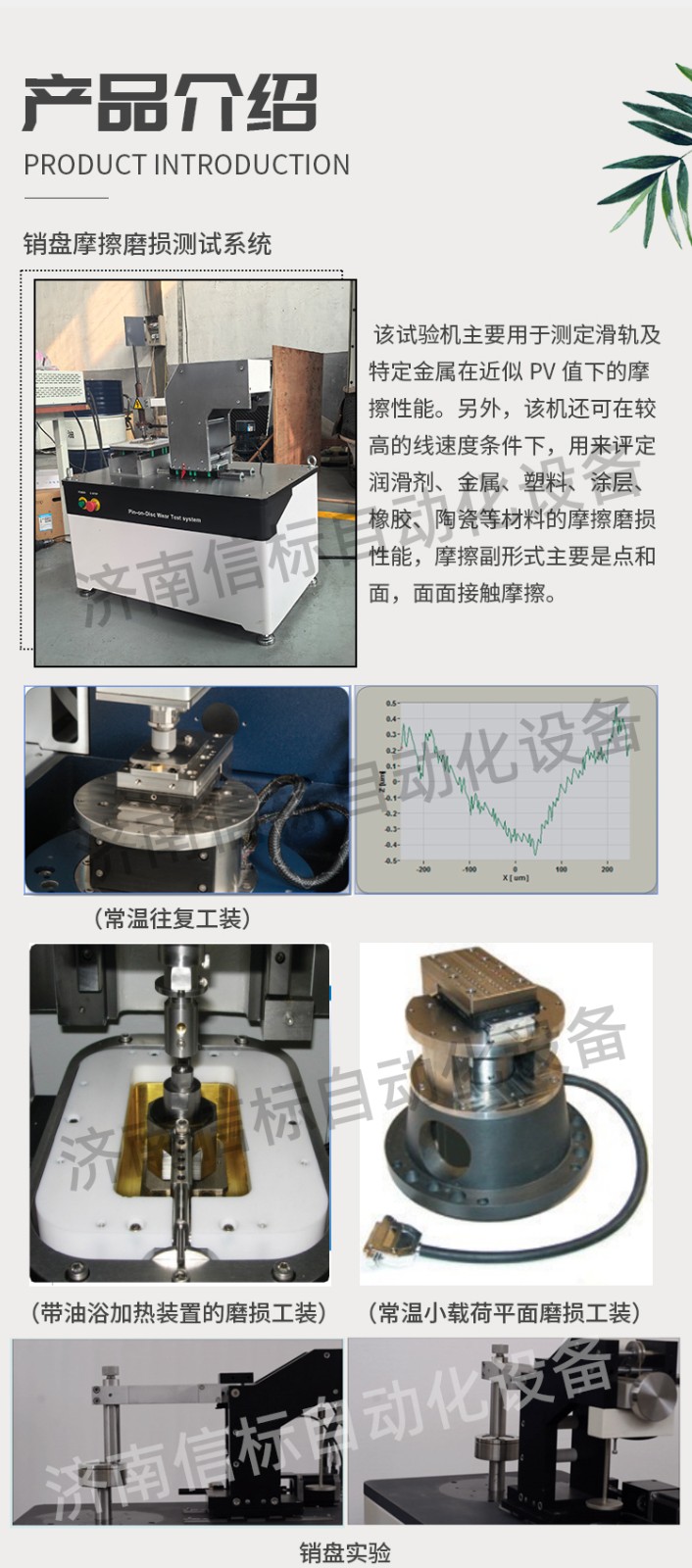 主要技術規格及技術參數 2.1法向加載:0.1-100N 2.2法向加載,并可實現試驗力的長時保持; 2.3 法向力值控制精度:±0.5% 2.4溫度控制范圍:-20°-100℃,紅外非接觸測量方式;(選配) 2.5工裝夾持范圍:33-160mm,可調 2.6 銷工位數: 1個 2.7 主軸轉速:0.1-1200r/min 2.8 最大線速度1000mm/min(定制) 2.9可連續長時間運轉,機器噪音≦40dB; 2.10運轉過程中產生的數據,如摩擦力、往復頻率、往復振幅,載荷波動、試樣溫度等均由計算機進行采集和進行實時處理,以數據圖表形式給出試驗結果,在同一時間坐標下采用不同顏色給出:載荷-時間、摩擦系數-時間、溫度-時間、位移-時間四條曲線,并可轉換成相應的“參數-路程曲線”,在計算機屏幕上實時顯示。所有數據由計算機記錄存盤,以供查閱和打印,數據可轉換成Excel格式。1.主要技術要求及滿足情況:(水平運動總成選配) 為滿足2的各項技術要求,本產品擬采用以下方案 3.1該試驗機由法向加載系統、水平杠桿,扭矩測力系統,溫控系統,其冷卻及潤滑裝置、電氣控制柜及計算機實時數據采集及控制系統(包括軟件)等部分組成; 試驗機主機主要由主機機座、水平機座、法向主軸及其驅動系統、試驗力施加裝置、摩擦扭矩及位移高精度傳感測量系統、試驗力測量及摩擦溫度測量系統等組成;試驗機法向加載系統采用杠桿+砝碼,精度高,可靠性好;水平加載系統采用直線電機作為加載系統,控制精度高,相應快,主機機座采用較大質量的鑄鐵件,固有頻率高,吸震抗震性能好,箱體座也是采用鐵件經數控鏜加工后將電主軸牢固鎖緊在箱體座中,這樣可以提高加載工作時的平穩性。
